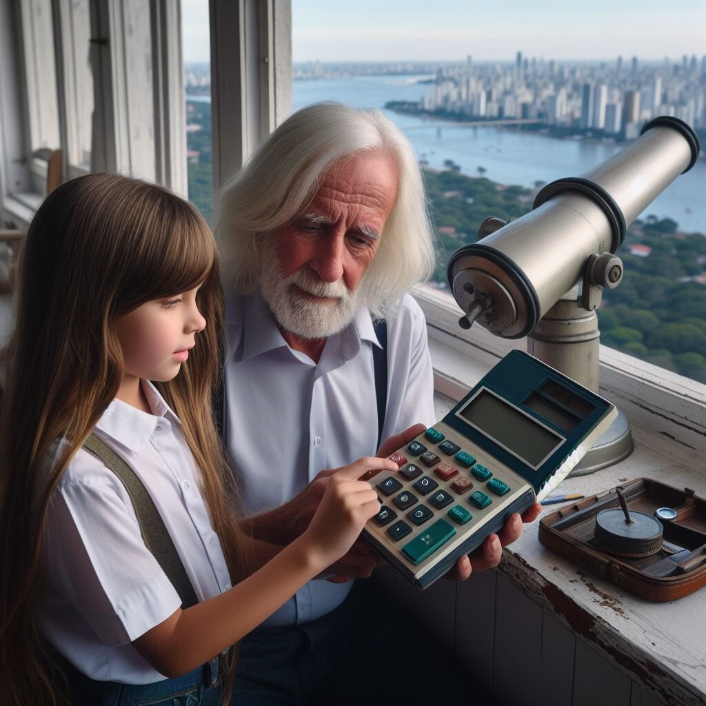 Retribuo o sorriso de meu avô e volto ao meu posto atrás das cortinas, porém minha paz é interrompida por sua voz que me chama de volta à saleta. Ele me aguarda com um pacote do tamanho de um radinho de pilhas nas mãos, que ele me estende com orgulho. “Fiquei sabendo que tu tiraste notas excelentes nas últimas provas. Isso aqui é uma recompensa pelo teu esforço”. Desconfiada, eu pego o embrulho e levo algum tempo até finalmente abrir o papel. Uma calculadora que faz as quatro operações! E ela é portátil! Meus colegas da escola vão morrer de inveja!