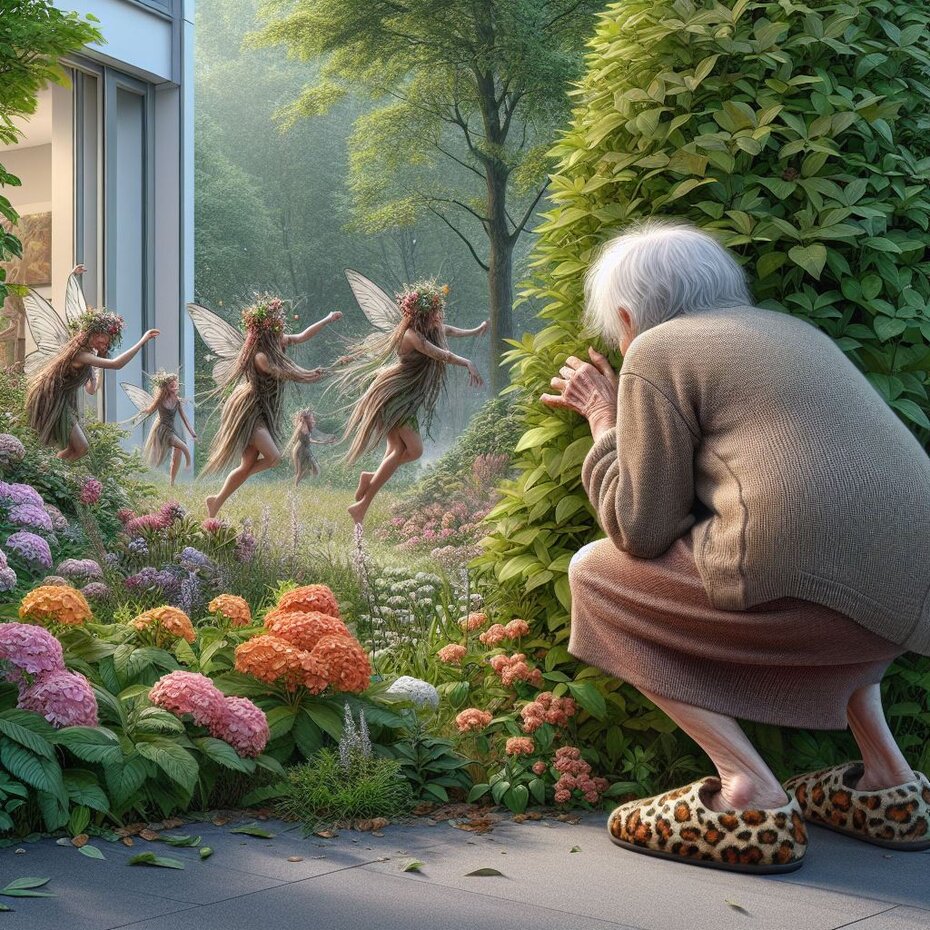 uma senhora esta agachada atras de uns arbustos, espiando um grupo de fadas dançando no jardim